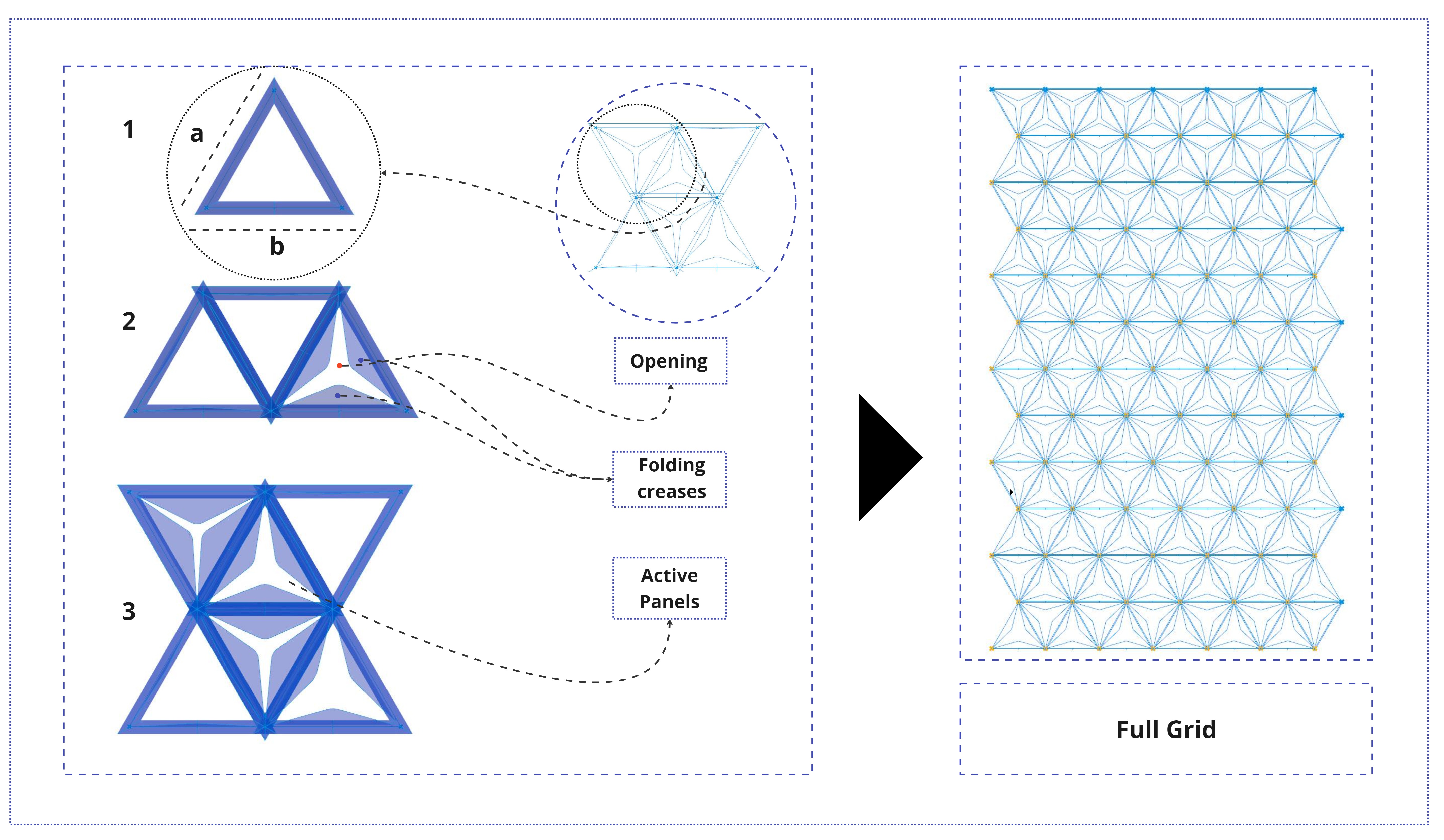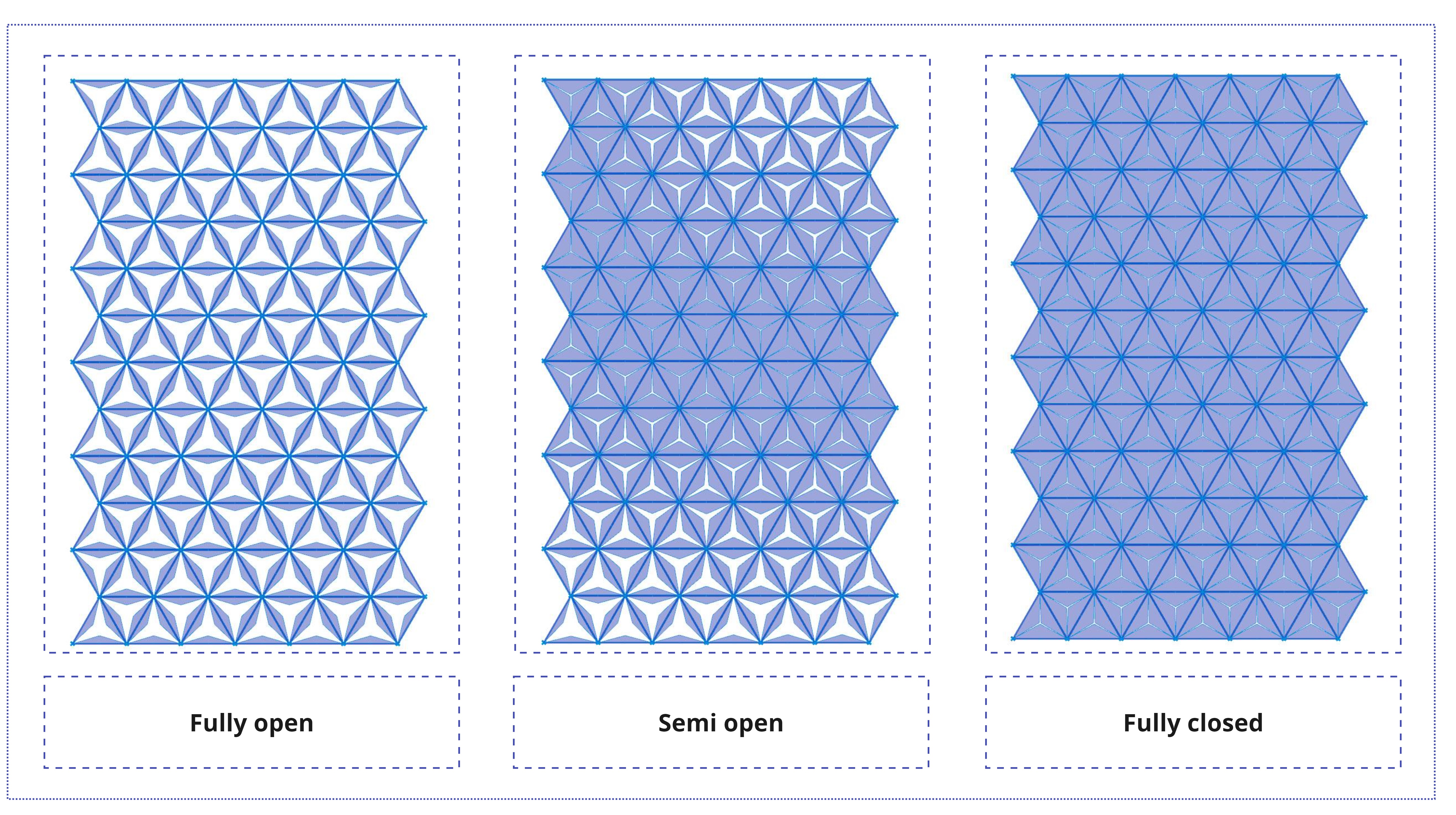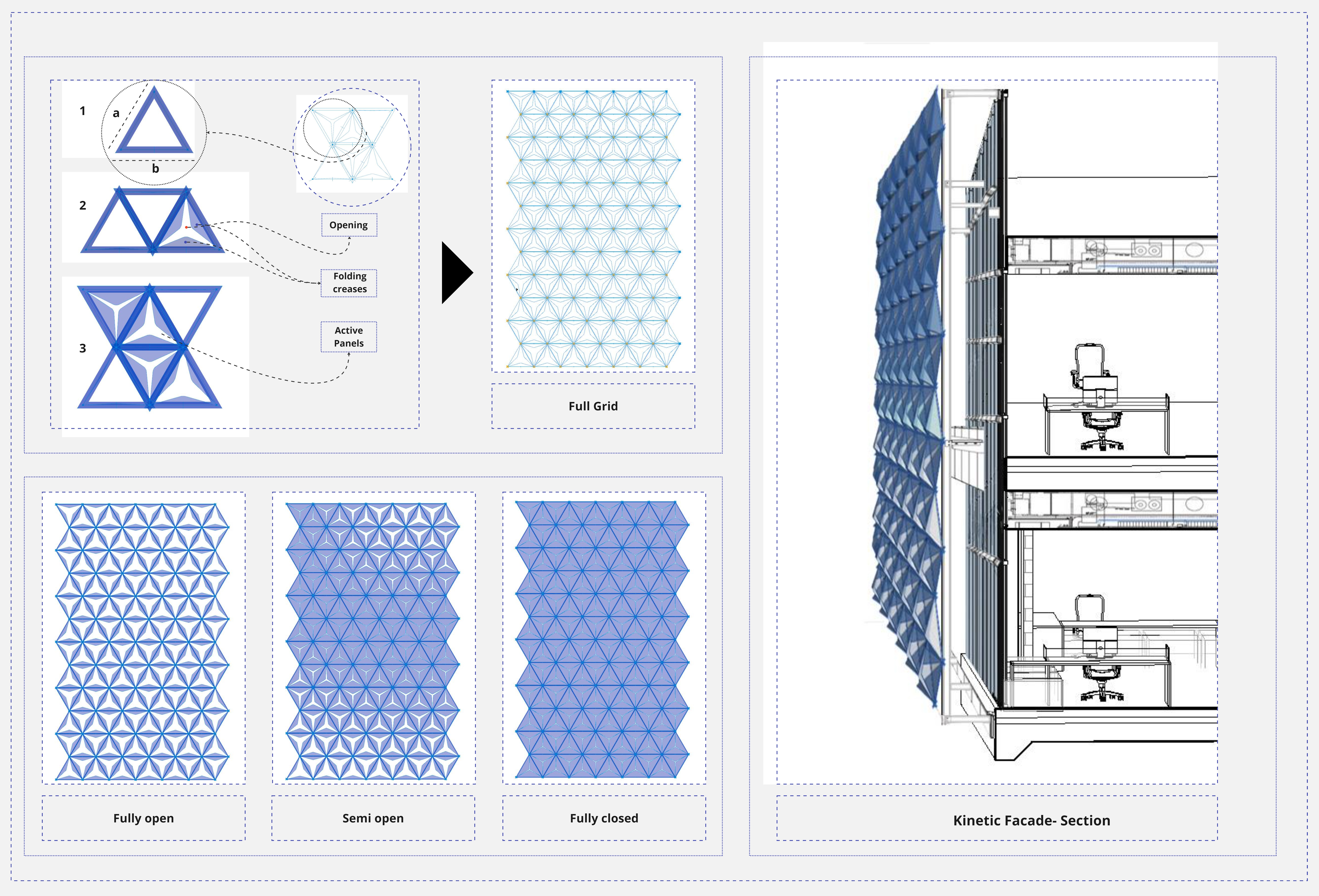 The design consists of triangular modular units that fold or unfold based on external lighting conditions. Each panel is programmed to open or close depending on the desired shading level: fully open for maximum light, semi-open for moderated glare, and fully closed to block direct sun. These states are driven by environmental data and controlled through Grasshopper definitions.