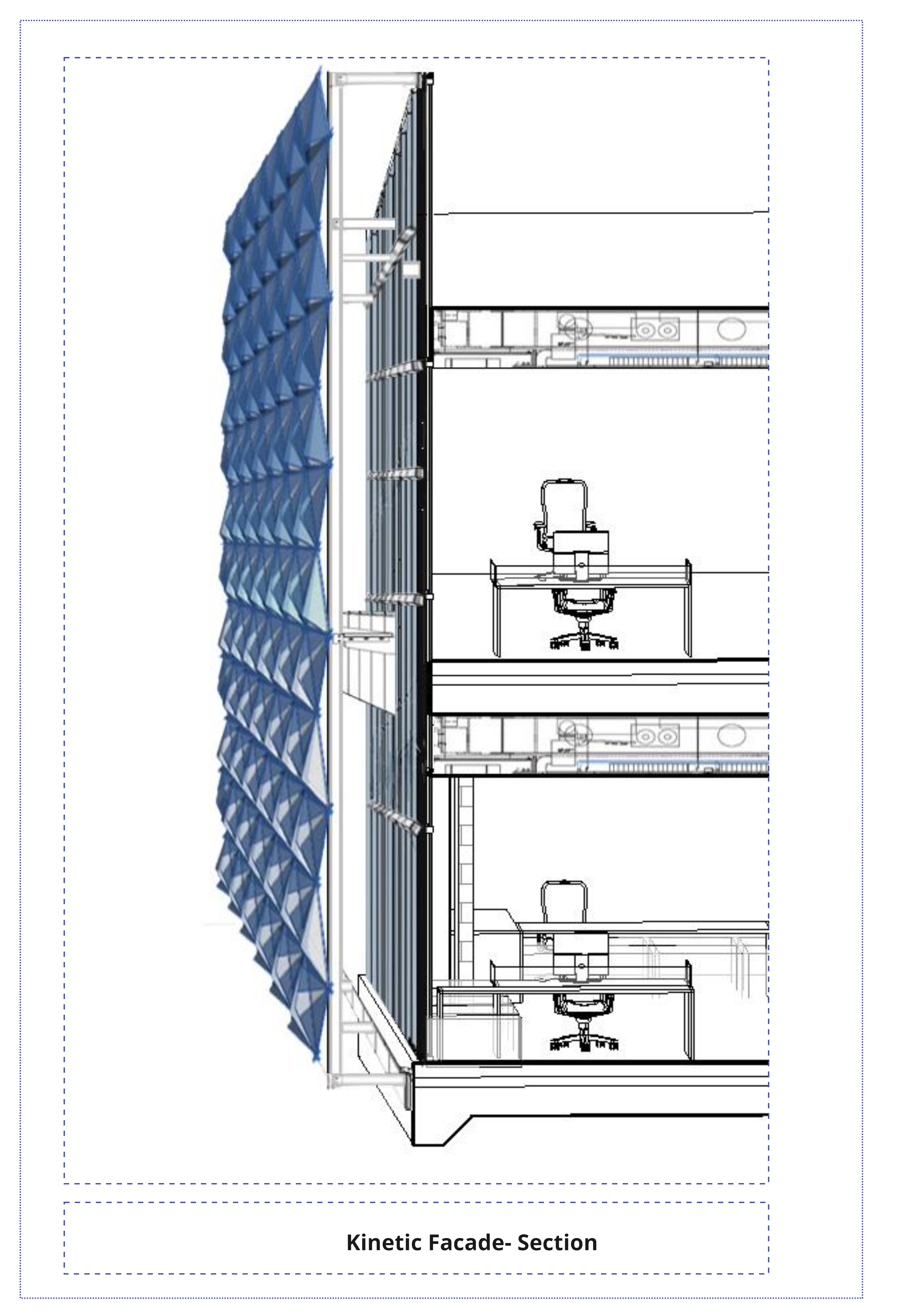 The system integrates into a full façade grid and is structurally supported via a sub-frame attached to the building envelope. Sectional diagrams show its spatial relationship to interior workspaces and illustrate how it balances light penetration with visual comfort. This prototype reflects a responsive, sustainable, and visually expressive approach to environmental design.
